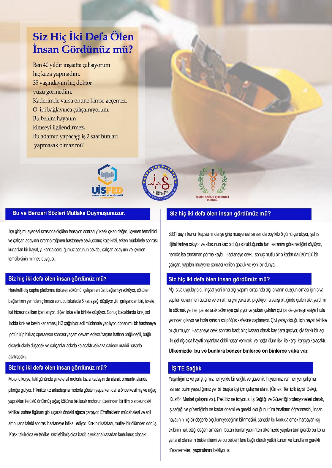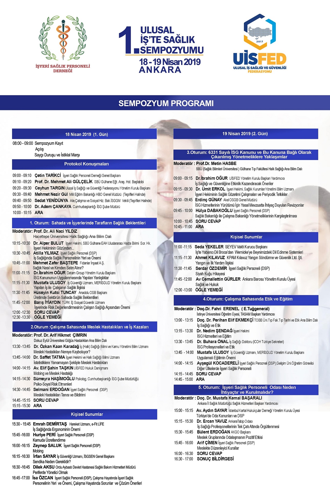 Ulusal İş Sağlığı ve Güvenliği Federasyonunun ve İşyeri Sağlık Personeli Derneğinin bu Yıl İlkini gerçekleştireceği “1.Ulusal İş’te Sağlık Sempozyumu” 18-19 Nisan 2019 tarihlerinde Ankara Sağlık Bilimleri Üniversitesi Gülhane Eğitim ve Araştırma Hastanesinde düzenlenecektir.